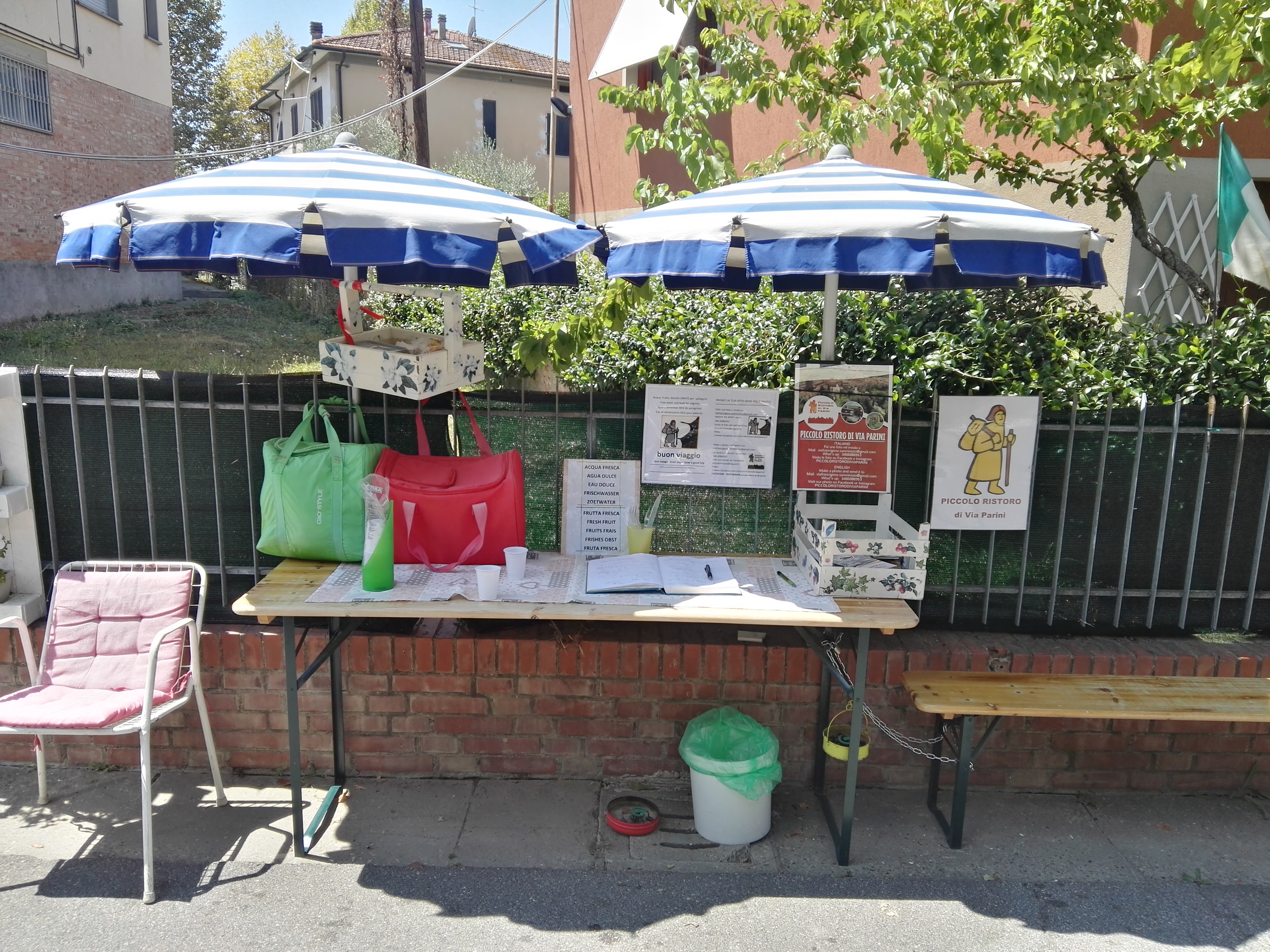 Ma prima di arrivare verso il centro del paese ci imbattiamo in una piacevolissima sospresa|! Con nostro grande stupore notiamo lungo la strada un piccolo banchetto chiamato ” PICCOLO RISTORO DI VIA PARINI”. Si tratta di una semplice bancarella con delle sedie e tavolini. Sul tavolino vi è un’agenda da far firmare a tutti i pellegrini che a piedi o in bici si fermano per riposare. Vicino all’agenda però vi è la sorpresa più grande di tutte! una borsa frigo lasciata da qualche buon uomo contenente bottiglie di acqua fresca e della frutta! anguria e mele!! un oasi di refrigerio! Ringraziamo ancora le persone che curano tutto questo. Cosi rinfrescati risaliamo in sella alle nostre mtb e pedaliamo per un paio di chilometri verso il centro del paese.