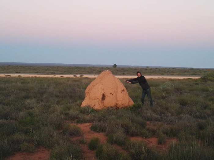 <<Wow!>> Siamo arrivati nel punto dove il sole culmina allo Zenit un giorno all’anno (nel soltsizo di dicembre). Un punto mitico dove fare la foto di rito è un obbligo! Ripartiamo e lungo la strada ammiriamo spettacolari termitai giganti. Opere architettoniche di fango create da laboriose termiti in decine di anni, che al loro interno, vivono al riparo dalle altissime temperature dell’Outback.
