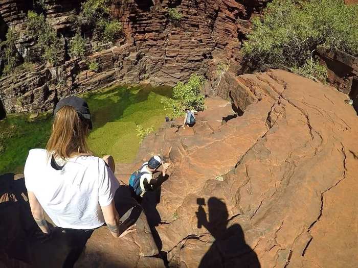 Il rosso della formazione rocciosa ci accompagna lungo un percorso ripido che si conclude con una fredda cascata d’acqua verdissima. Non credo ai miei occhi! Che meraviglia! Camminiamo lungo i sentieri selvaggi del canyon visitando altre cascate. Noto che da qualche cascata scende poca acqua, a causa della secca stagione invernale australiana. La massima portata d’acqua la si vedrà cadere durante le due settimane della stagione delle piogge.