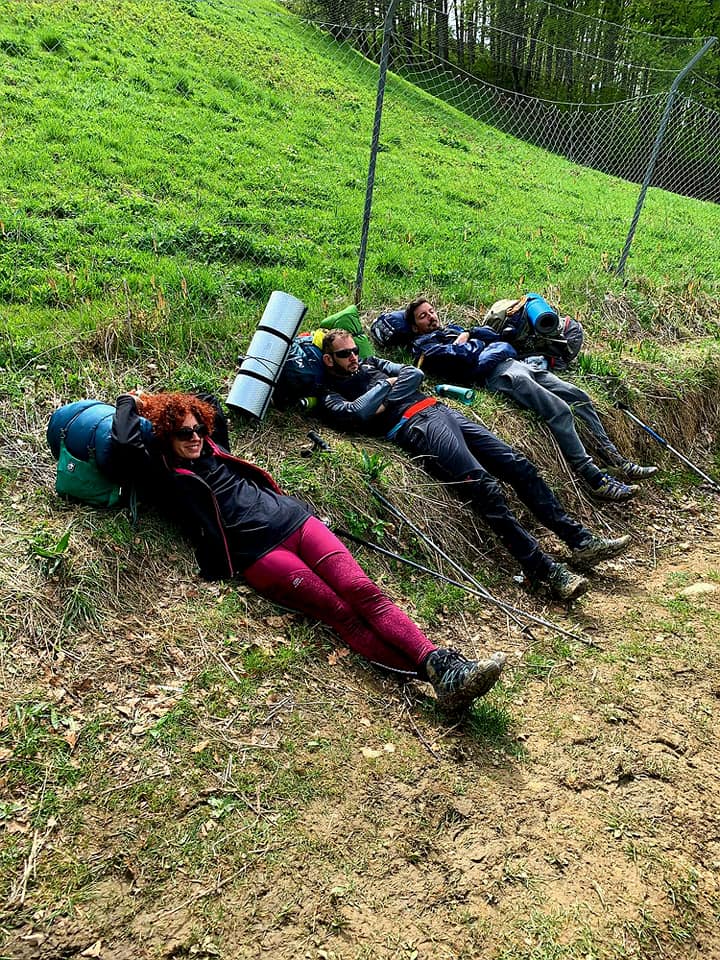 Di buon mattino mi sveglio con le gambe pesantissime quasi bloccate. Non riesco a stare in piedi. La stessa sofferenza è percepita anche dai miei compagni di viaggio: Tommaso, Roberto, Chiara e Simone. All’improvviso notiamo che una persona mancava all’appello. La fatica aveva fatto la sua prima vittima: Azzurra infatti ci aveva abbandonato ritirandosi dal cammino. Probabilmente nella notte senza dir nulla a nessuno aveva deciso di mollare e ritornare a Roma. Complimenti comunque a lei… non è di certo impresa facile percorrere 40 chilometri sugli Appennini in una sola giornata! La determinazione in questi viaggi è un elemento fondamentale e dopo una veloce lavata di faccia in una fontanella del parco smontando le tende facendo una ricca colazione torniamo in pista proseguendo sui sentieri montani in direzione Madonna dei Fornelli. Le gambe nonostante sembrassero bloccate pian piano si scioglievano andavano avanti da sole comandate dall’entusiasmo e dalla voglia di superare i nostri limiti. Dopo venti minuti giungiamo a Campagne camminando in uno stupendo bosco di castagni. Poi la salita fino a Monte del Galletto e finalmente dopo circa tre ore su strada sterrata giungiamo a Madonna dei Fornelli. Il sentiero prosegue in una meravigliosa foresta scendendo giù fino al quadrivio di Pan Balestra, due ore di cammino dopo Madonna dei Fornelli. Da qui inizia la storica e mitica “Flaminia Militare” antico percorso romano datato 187 a.C. Nel bel mezzo della foresta appenninica giungiamo davanti ad un recinto e un cancello con scritto “Chiudere il cancello grazie”. Ci passo e lo chiudo ( non si sa perché, probabilmente per non far entrare animali da bestiame) e faccio passare anche i miei compagni di viaggio. Proseguiamo fino alla Piana degli Ossi ed emozionato ammiro i resti di un’antica fornace datata II secolo a.C. Dopo diversi sali scendi molto faticosi giungiamo in una piana denominata radura delle Banditacce. Qui ci fermiamo a prendere fiato e far riposare la schiena perché quella che ci attende sarà una delle salite tra le più faticose dell’intero cammino che ci porterà sul punto più alto di tutto il percorso di 1200 metri di altitudine. Oltre ad essere la cima più alta è il punto quasi esatto che rappresenta la metà del cammino tra Bologna e Firenze! Giungiamo In cima e soddisfatti ci riposiamo. Bello gustare la natura che ci sta ospitando. La discesa ci regala testimonianze storiche dell’antica presenza romana! Una meraviglia! Camminiamo in mezzo a boschi di conifere in direzione Futa nostro secondo obbiettivo del cammino. Sul Passo della Futa infatti si trova un camping dove pensavamo di passarci la notte. A pochi chilometri dal camping si trova un punto di interesse storico incredibile: il cimitero germanico. Emozionati ci togliamo gli zaini dalle spalle e come bimbi curiosi ci addentriamo per visitarlo. Prima che il buio scenda ci incamminiamo verso il campeggio e dopo aver montato le tende ci buttiamo soddisfatti sotto una calda doccia! Erano quasi due giorni che non mi lavavo e devo dire che dopo tutto questo sforzo una doccia d’acqua calda è il massimo che si possa desiderare.