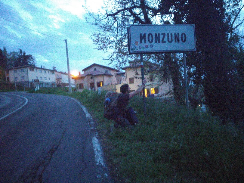 Parto in auto da Milano insieme a Tommaso e Roberto e giunti a Bologna ci fermiamo a dormire in un ostello situato in centro. All’alba zaini in spalla, partiamo dalla meravigliosa Piazza Maggiore. Nonostante siano le 6 di mattina altri viaggiatori camminatori come noi sono pronti per partire per il lungo cammino. Qui si aggiungono Chiara e Azzurra, due ragazze romane che decidono di affrontare il cammino insieme a noi. La colazione a base di panino con la mortadella e cioccolato ci sosterrà per molti chilometri e al grido << CARICIII CARICIII !>> partiamo! Il ritmo è buono e le gambe vanno da sole. Sono ben allenato e preparato tra trekking, palestra, mountain bike e con la testa libera vado avanti nonostante i 13 chili del peso del mio zaino. Cammino lungo la strada asfaltata che attraversa la bellissima Bologna e pian piano sale sempre di più passando da San Luca con i suoi archi sotto il portico più lungo del mondo che mi porta al santuario della beata vergine. Qui ci fermiamo per scattare una foto di rito e per scambiare parole di entusiasmo con altri gruppi di camminatori. Scendiamo giù a Casalecchio di Reno e costeggiando il Reno iniziamo finalmente un sentiero sterrato giungiendo a Sasso Marconi. Qui resto incantato davanti alla vista dell’acquedotto romano e del ponte di Vizzano. Al nostro gruppetto di camminatori si aggiunge il bergamasco Simone, un gran montanaro davvero tosto! Sarà un membro portante del nostro gruppo! Continuiamo verso l’area protetta di Contrafforte Pliocenico con i suoi fossili e la sua vegetazione particolare. Stremati ripartiamo in direzione Monzuno, il primo vero obbiettivo di sosta del nostro cammino. Ma prima si doveva salire in cima al Monte Adone. ( Il nome del Dio Adone dona il nome al monte come altri monti hanno nomi di altri Dei, e per questo si chiama “Cammino degli Dei”..) Stanchi ci rimbocchiamo le maniche e determinati raggiungiamo la cima rampicandoci su un sentiero ripido nel cuore dello splendido appennino emiliano. Una volta giunti in cima le due croci ci fanno sorridere di sofferenza ma godere di un bellissimo panorama. Sono esausto ma l’aver attraversato una natura meravigliosa e visto una buona parte di storia dell’umanità fa esclamare “wow!”. Finalmente un po’ di discesa verso Brento e poi ancora salita su strada asfaltata passando da Monterumici in direzione Monzuno. Ora apro una parentesi giurandovi che quello che è accaduto da Brento a Monzuno ha del miracoloso… Già perché a tutti noi le forze e le gambe stavano per cedere, cosi come le nostre schiene a causa del peso dello zaino, ma la nostra testa era tanto determinata ad arrivare… A Monzuno… questo paese per noi “leggendario” che a un certo punto credevamo non esistesse nemmeno, talmente eravamo esausti e stanchi. le allucinazioni stavano per prendere il sopravvento sui nostri corpi non più lucidi quando all’improvviso la sagoma del cartello “BENVENUTI A MONZUNO” apparve lungo la ripida strada in salita. Ebbene si! Dopo 14 ore di cammino e 40 chilometri percorsi con dislivelli terribili di mille metri finalmente eravamo giunti alla prima meta! Increduli, distrutti, affamati e anche nervosi, lasciamo andare le nostre sofferenze buttandoci in una cena a base di pasta e carne in una trattoria del paese. Finita la cena e recuperate le calorie, montiamo le tende nei pressi di un parco giochi per bambini. Stanco e stremato mi addormento rigustandomi in un sogno la durissima tappa appena passata e il percorso che ancora dovrò e dovremo compiere.