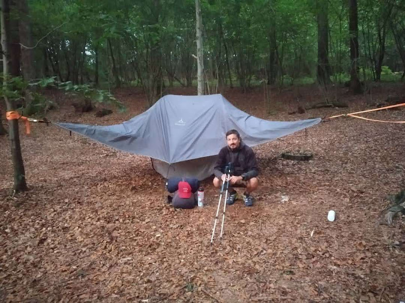 Giungiamo stanchi ma soddisfatti in un camping sulle colline a Sala Biellese. Ci aspetta una tenda sospesa da terra, con legate le sue stremità a tronchi di forti alberi. Dormiamo sotto un cielo di stelle e pioggia, in una tenda sospesa tra due alberi e la libertà.
