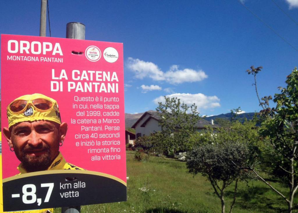 Camminando nei momenti di dolore e sofferenza ho pensato molto a lui, il pirata, che con la sua determinazione qui ha sconfitto la sfortuna, il salto di catena ai piedi dell’ultima salita, e ha saputo rimontare tutti scalando la montagna fino ad Oropa. Un esempio di forza di volontà che ho percepito sotto forma di energia mentre percorrevo la strada fino al mitico traguardo del Santuario. Quella fu un’impresa epica non di certo come la mia… ma nel mio piccolo, ora che sono qui vincente con le mani al cielo davanti al Santuario, mi sento svuotato delle mie forze fisiche ma possiedo uno zaino ancor più carico di conoscenza, interiorità ed emozioni.