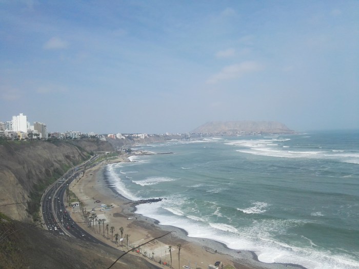 Bellissimo, enorme e si sente il forte rumore delle onde che si infrangono sulla spiaggia. Resto per un istante muto ad a osservarlo. Lo osservo dall’alto perché sotto i miei piedi un’altissima scogliera mantiene questa parte della città di Lima ad un’altezza superiore di circa un centinaio di metri sull’oceano. Quasi a protteggerla. Soffia un forte vento e i surfisti sulla spiagga ne gioiscono.